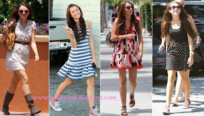 Mas Miley também fica bem em tons pastéis, que estão com tudo, e aqui mostra seu lado mais fashionista: o primeiro e o terceiro vestidos tem estampas de estrela, super tendência. Já o segundo tem o efeito de "meia-saia", que apareceu em várias passarelas recentemente. Já o último, tomara-que-caia balonê com cintura marcada, vem num tom rosa-bebê que é a cara desse verão.