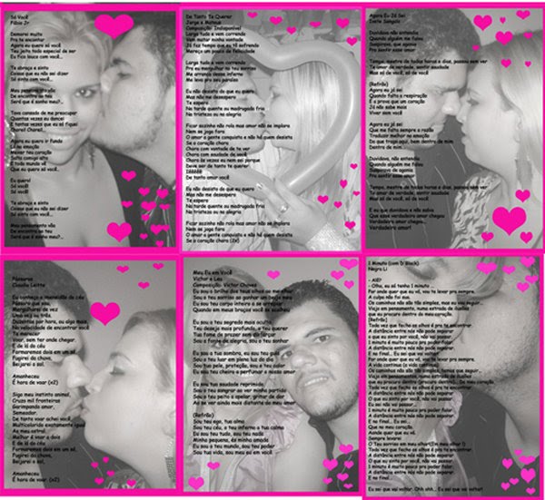 * com a ajuda de algum editor de imagens ( photoshop, corel, paint) deixe as fotos bem claras, faça uma borda e cole a letra da musica, (se você quer algo bem mais especial é legal procurar uma foto de vocês que tenha haver com a musica )
