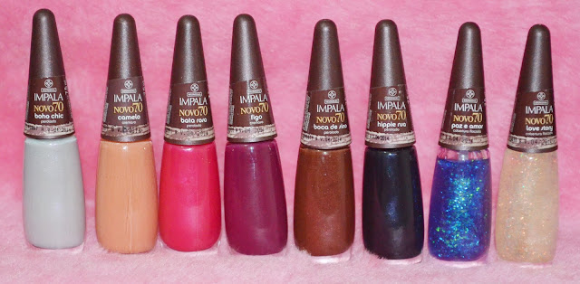 impala já lançou uma nova coleção e eu ainda nem resenhei a antiga heheeh, estou com eles separados a 2 meses, mas não tinha tido tempo de fotografar, aproveitei o feriadão e resenhei várias coleções. vou soltando aos poucos por aqui.A coleção “Novo 70” da Impala foi inspirada na década de 70 e possui 8 esmaltes, divididos em 3 tipos coberturas diferentes, cremosos, perolados e flocados.