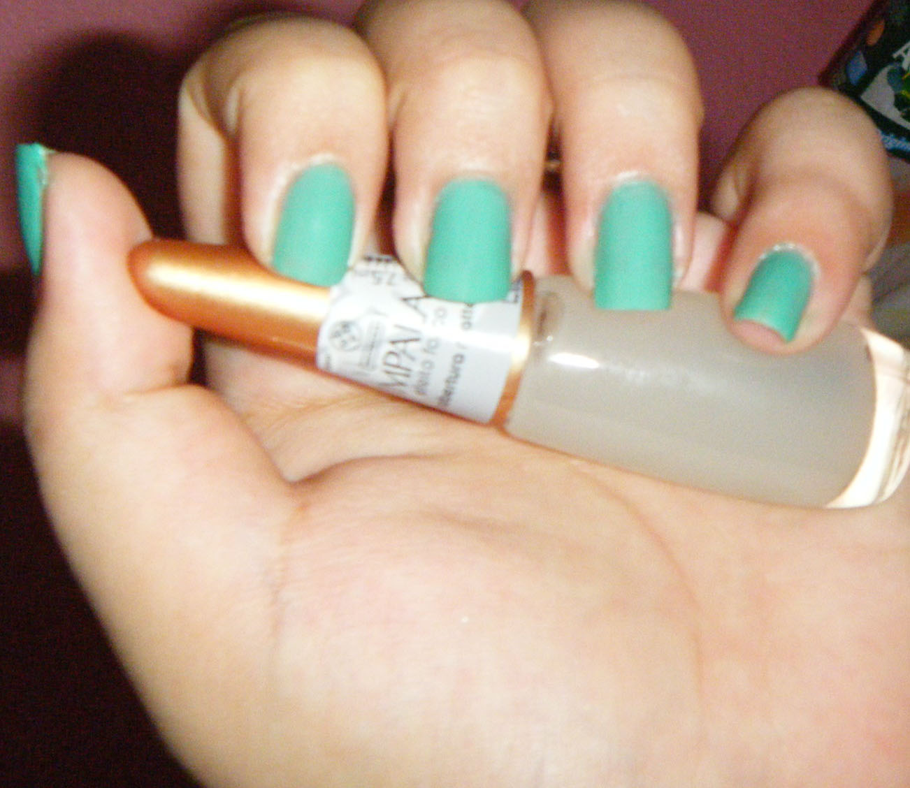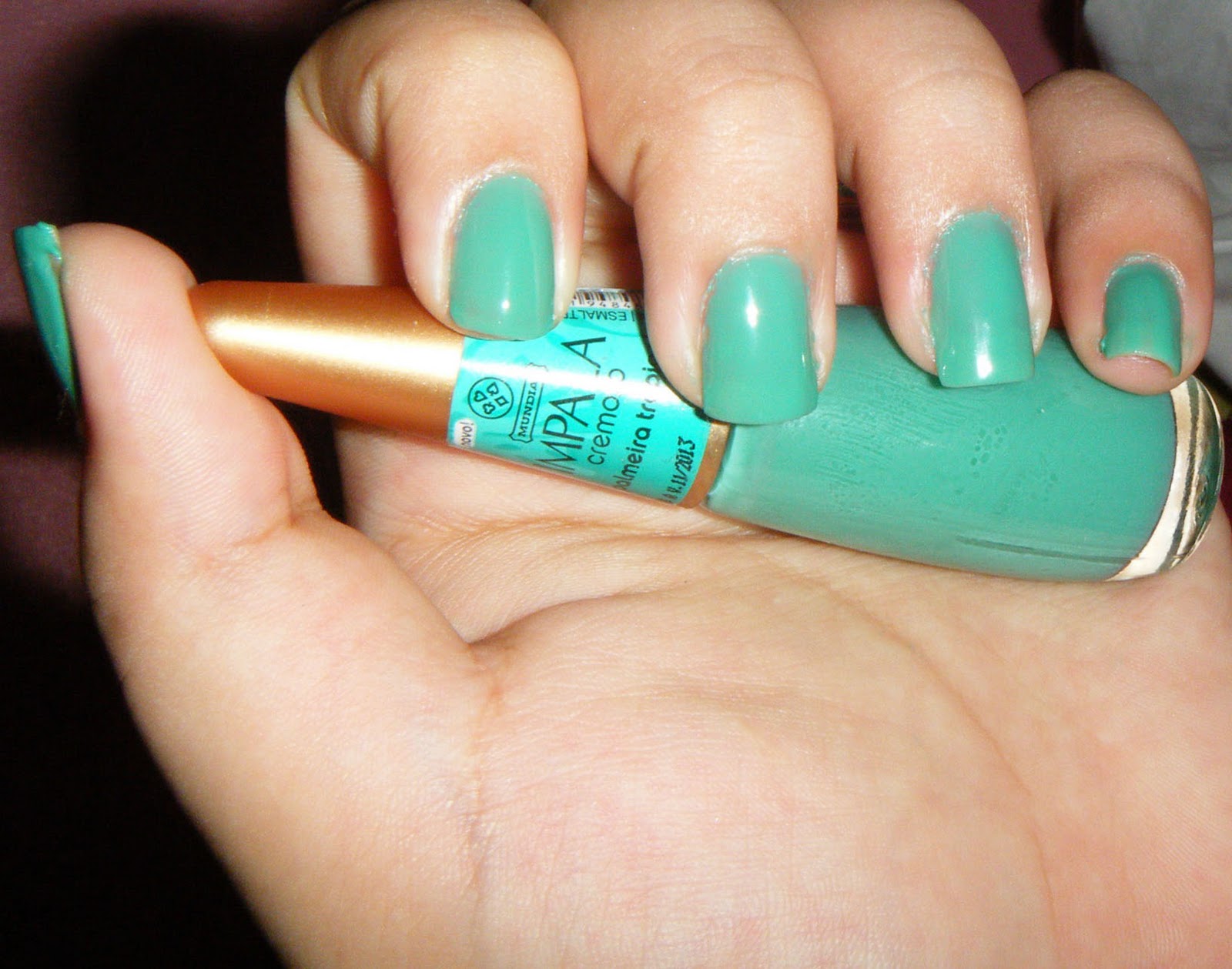 Eu escolhi para passar o palmeira tropical, um verde muito lindo, que mesmo sem gostar muito de esmalte fosco, achei um arraso com a cobertura matte.