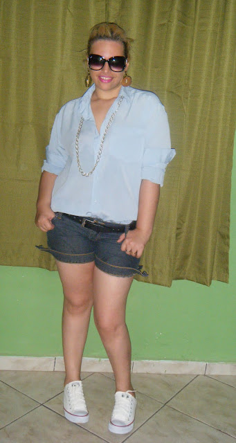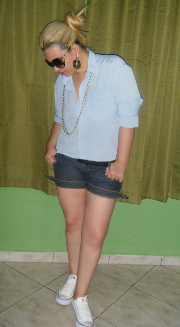 Estava fuçando o guarda roupas do namorado procurando uma camisa diferente, e encontrei essa azul que me lembrou as camisas jeans que estão super em alta!! Não pensei duas vezes, shortinho jeans mais escuro, all star e coque alto para aguentar o calor!!! Gostei tanto do look que já estou pagando a língua e quero uma camisa jeans bem masculina djha ( achava uó)!!! Pra não deixar muito sem graça, coloquei corretes e brinco dourados, para ascender o visu…
