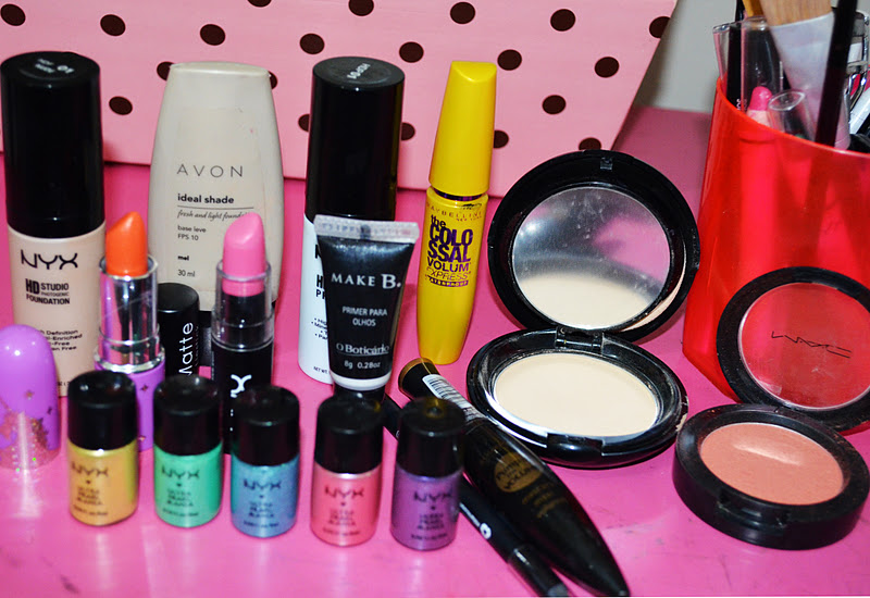 Base Hd Nyx Base Mel Avon ( misturei as 2 pra dá o tom ideal da minha pele) Primer HD Nyx Mascara Colossal Pó compacto Nyx Blush Mac Springsheen Batom laranja My Beautiful Rocket Batom Audrey matte Nyx Primer Make B Mascara Borjouis Delineador Millani( maravilhosooo) Pigmentos Nyx nas cores, yellow, jade, turquoise, pink e purple