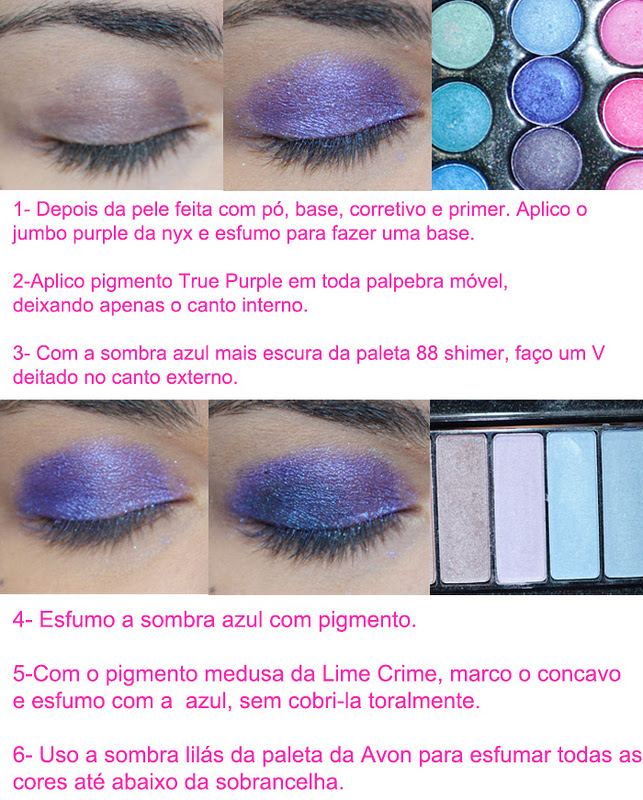 Nyx jumbo- purple, rimel maybelline + Eyeko magic mascara, Sombra em pó lime crime- Abracadabra, batom NYX – Frosted Flakes + Batom MAC – Hal´f naif, base intense, studio fix MAC, paleta Make it pink 1- Capricho O Boticario, Primer para olhos- O boticario.