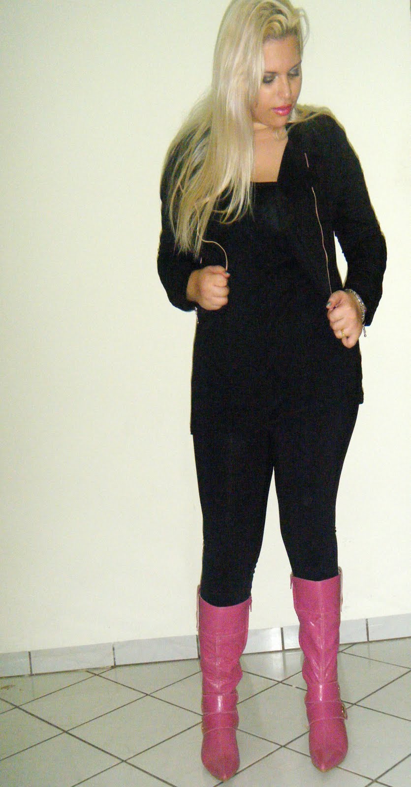 Sexta resolvi dar o ar da minha graça ( metidaa) pelas ruas da expoara 2011, foi uma coisa mega repentina e eu tinha meia hora pra me arrumar!!Ou seja escovar e chapar cabelo, make e look em 30 minutinhos é record neh?! Aproveitei pra usar minha bota pinK que ah tempos pede pra sair do armário!! Essa bota é meio que exclusiva, eu queria muito uma bota rosa e não encontrava em lugar nenhum, estava bem no começo do blog, e uma das leitoras na época era designer de uma marca que eu não conhecia, a Um Terço, ela me mostrou o site e eu entrei em contato pra ver se eles fabricavam uma bota especial pra mim, e ai depois de alguns e-mails, negocio fechado, eu escolhi tudo por e-mail, eles me mostraram o om de rosa que tinham, as ferragens e assim surgiu minha bota!!