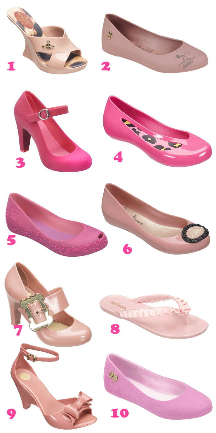 1-Vivienne Westwood Anglomania + Melissa Wedge II, 2-Melissa Wanting + Snoopy, 3-Melissa Temptation Degradê, 4-Melissa night, 5-Melissa Ultragirl Flocada, 6-Vivienne Westwood Anglomania + 7-Melissa Ultragirl VII,7-Vivienne Westwood Anglomania + Melissa Temptation II ,8-Melissa Cute + Salinas II, 9-Melissa Mermaid IV, 10-Melissa Wanting