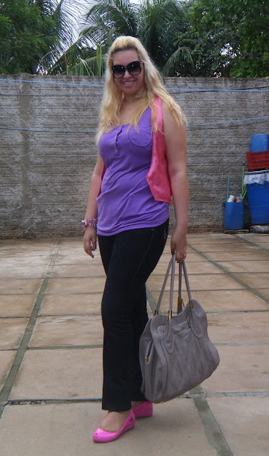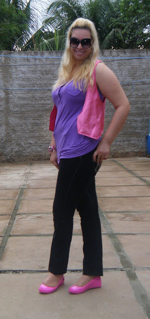 Um look básico, com cores bem alegres, que usei em uma tarde de trabalho!!! È bem simples, mas postei porque queria dividir com vocês minha nova melissa preferida, a ultra VW, além desse rosa lindo, o plástico veio mais molinho que as outras o que a deixou super confortável, eu devo ter umas 8 ultras( vou da update naquele post das melissas) e todas machucam em cima, essa eu ando o dia todo e é super macia!!Ponto pra melissa que só decepcionando nos últimos tempos!!!Adorei essa combinação de roxo com rosa!!!
