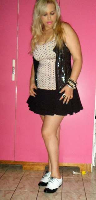 Regata: Silvana Boutique Colete de paetes: Tribo Saia: Lila Pink Oxford: Melissa Joy AH Colar usado como pulseira: Lila Pink Store Maxi anel: Pink Biju