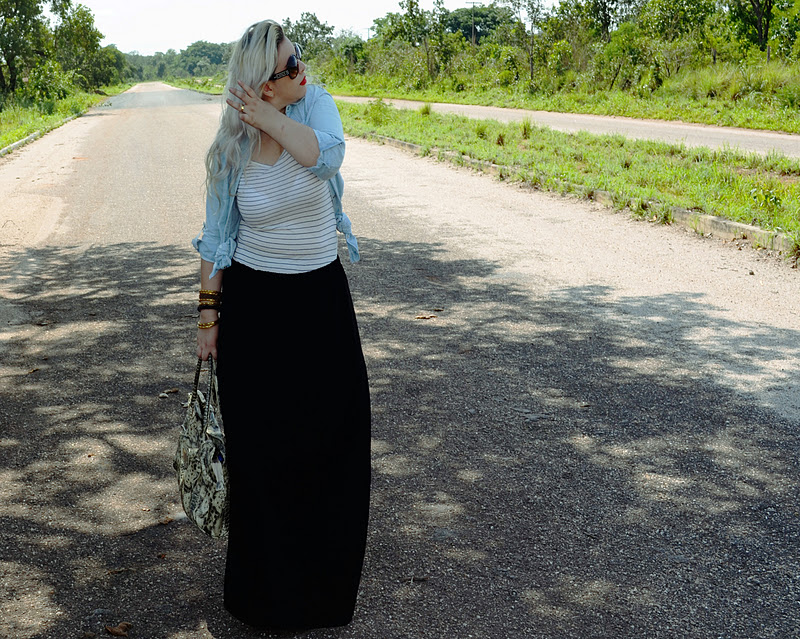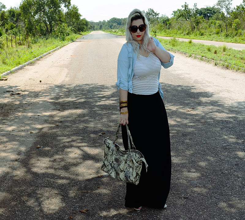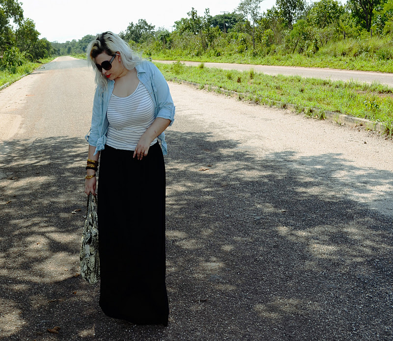 Juntei 3 peças que eu amo demais e uso muito, essa blusinha de listras fininhas azuis, a saia longa preta e a camisa jeans. Eu bem poderia montar mais um look com inspiração navy, porém resolvi misturar umas peças rusticas para um look mais boho.