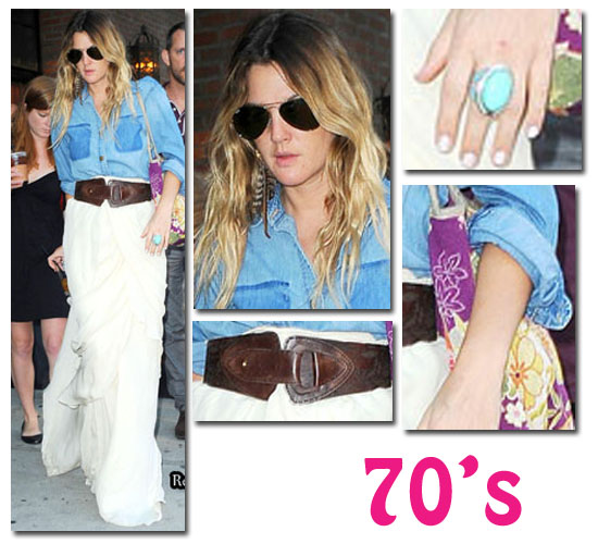 Já faz uns dias que estou ensaiando um post sobre esse comprimento que eu amo e que é sensação nesse verão!!!!Quando vi essa look da Drew fiquei mais apaixonada ainda, ela usou a saia longa com varias trends no maior estilo 70’s, que eu estou amando toda essa coisa hippie chic da mulherada fashionista!!!