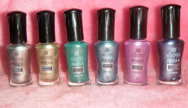 Essa coleção foi lançada j´tem um bom tempo, mais só agora consegui encontrar, e olha vale o esforço e a busca, porque eles são simplesmente PERFEITOS!! Quem acompanha o blog desde o comecinho sabe como eu ralei para encontrar esmaltes dourados e prata que fossem realmente cromados e não consegui!!! A busca acabou a linha é composta de 6 cores onde 4 são realmente cromadas e 2 metalizadas ( O risque aprende!!) são elas: Excellence – Prata,Vibrancy -Dourado, Evolution -Verde, Supreme – Azul, Especial – Rosa e Absolut – Lilás.
